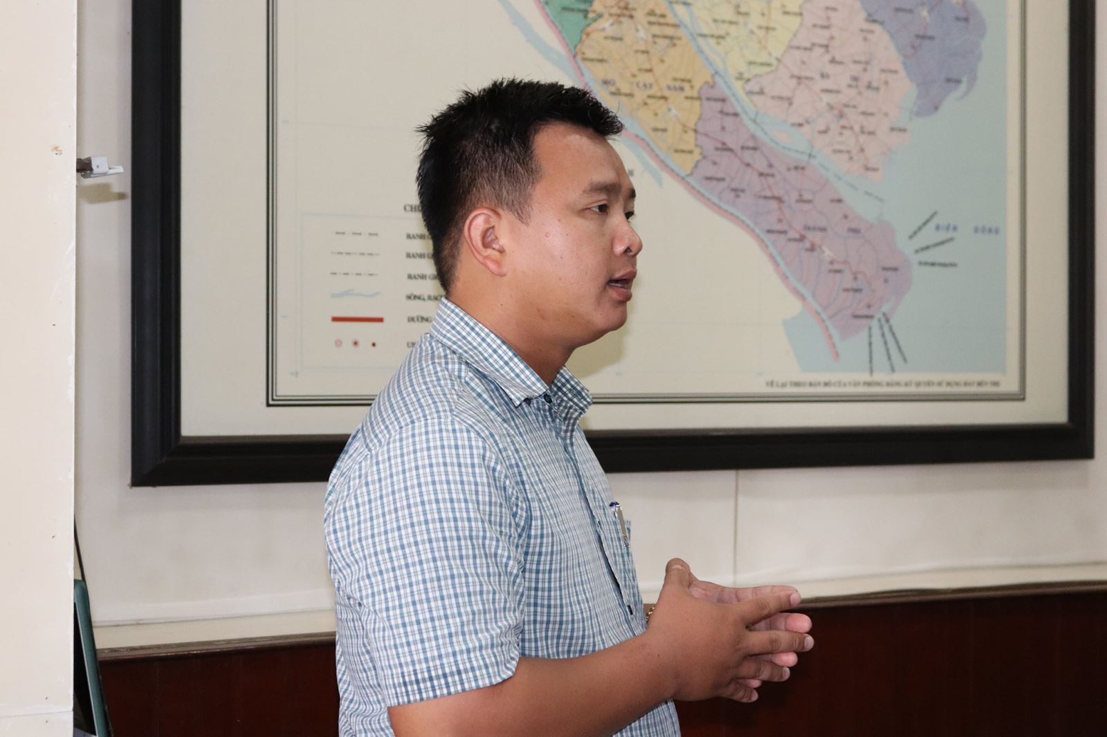Thiếu tá Võ Minh Chinh - Phó đội trưởng Phòng An ninh chính trị nội bộ, Công an tỉnh Bến Tre báo cáo chuyên đề