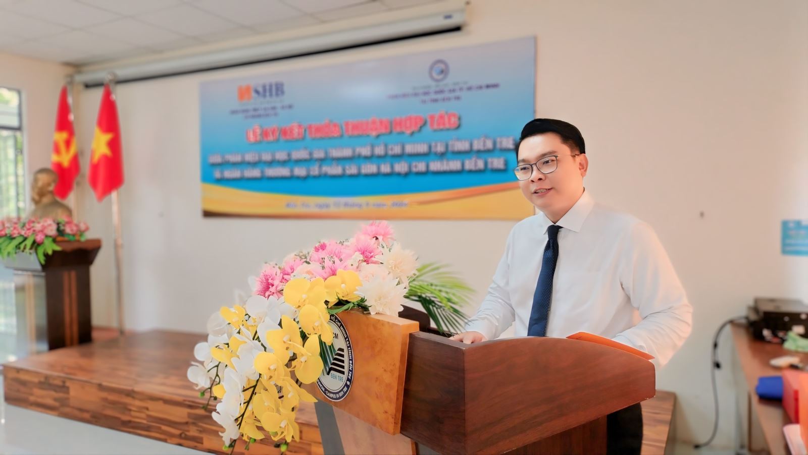 02 bên tiến hành thực hiện nghi thức ký kết bởi Ông Huỳnh Thanh Huấn (đại diện Ngân hàng TMCP Sài Gòn - Hà Nội, Chi nhánh Bến Tre) và TS. Phạm Huỳnh Minh Hùng (đại diện Phân hiệu ĐHQG-HCM) với sự chứng kiến của đại diện lãnh đạo các phòng, ban, đại biểu đôi bên.