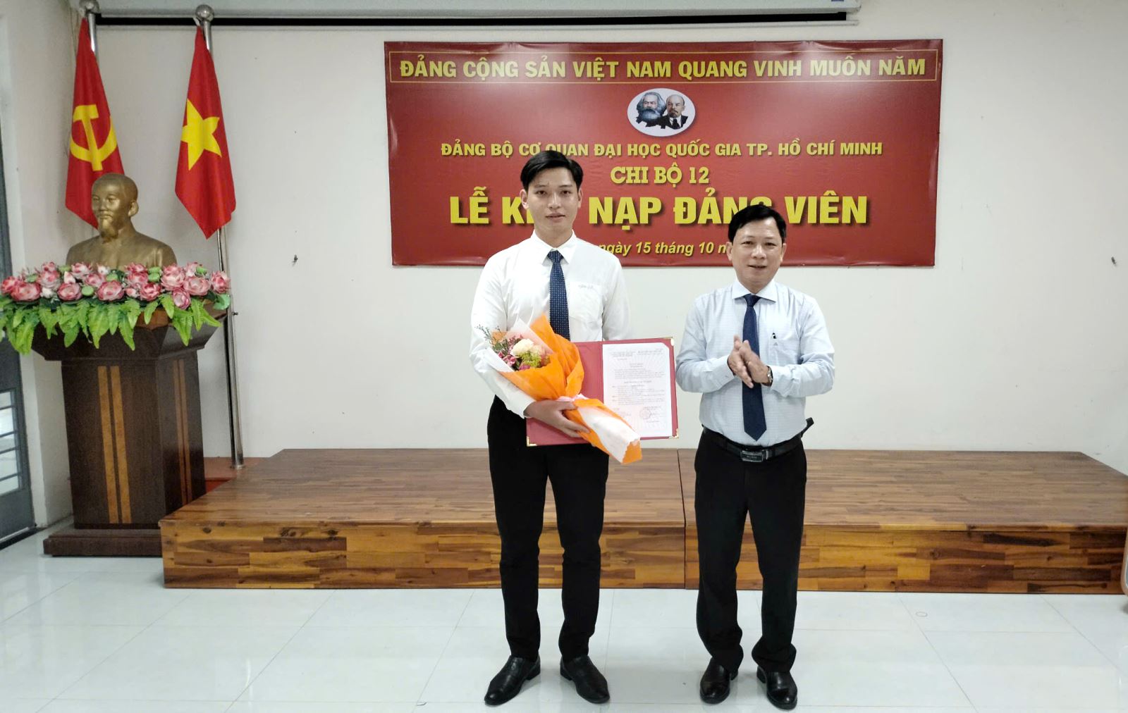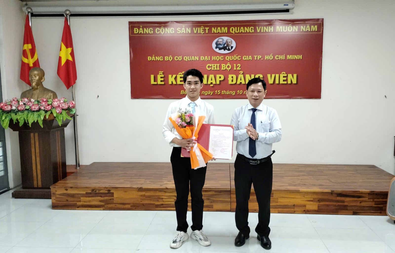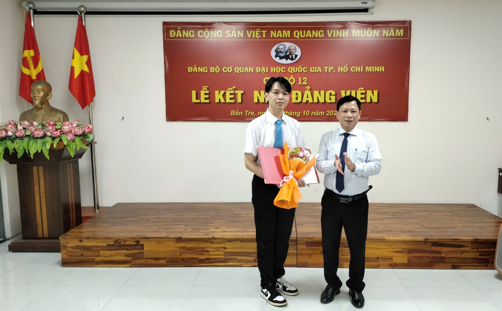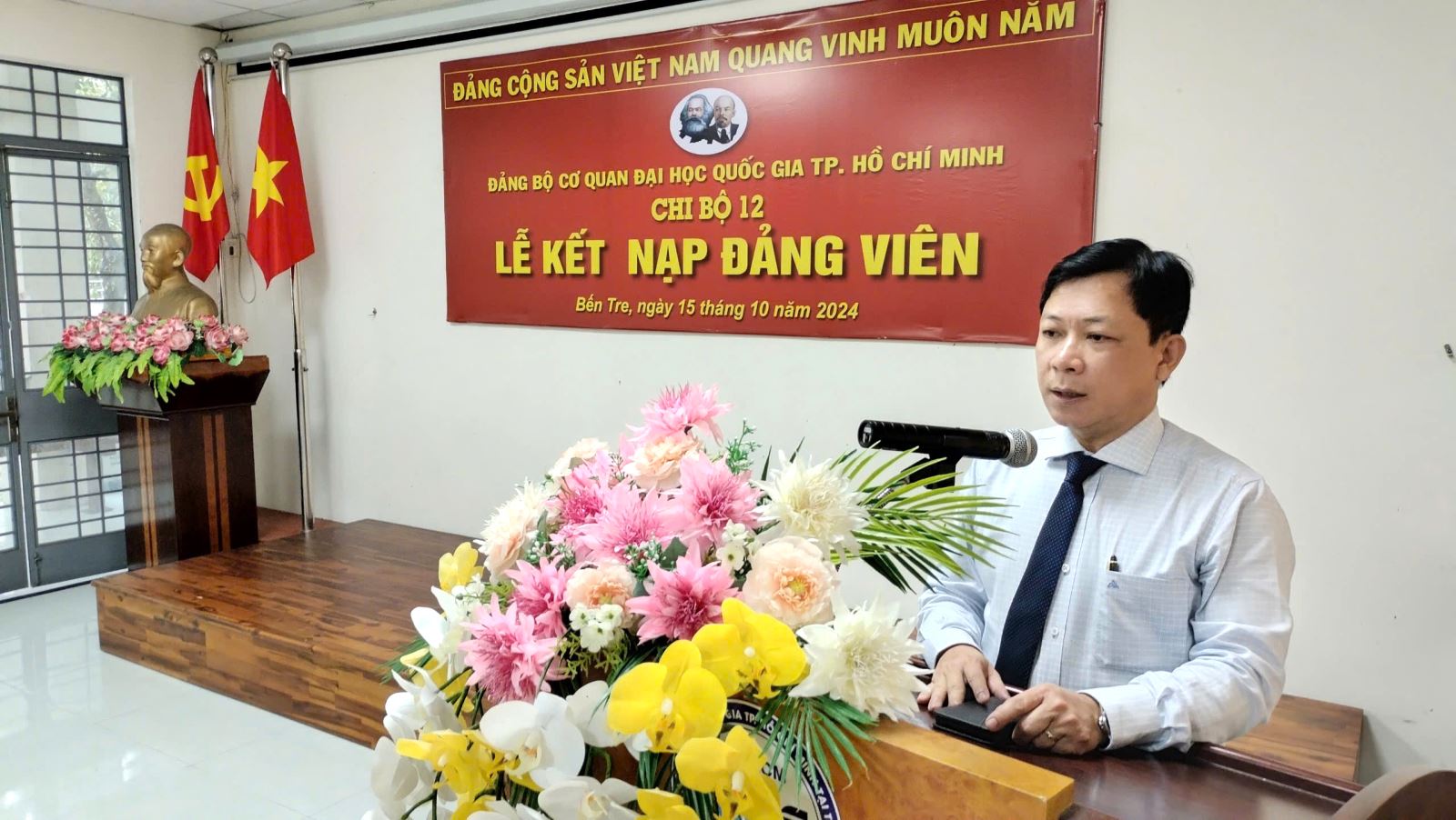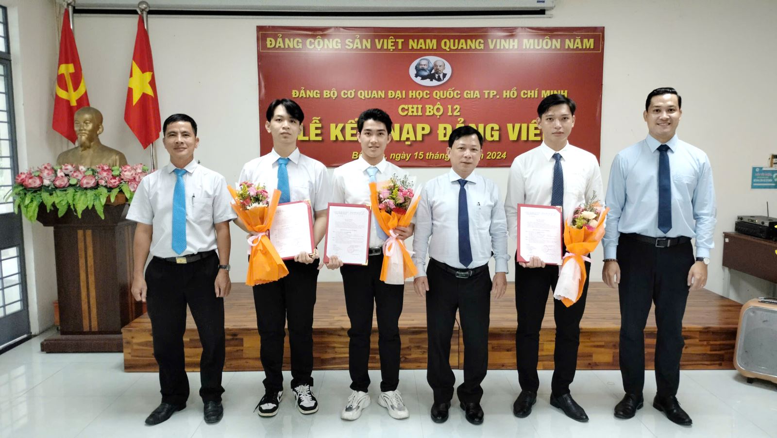 Chiều ngày 15/10/2024, Chi bộ 12 trực thuộc Đảng bộ Cơ quan ĐHQG-HCM đã long trọng tổ chức Lễ Kết nạp đảng viên cho 03 quần chúng ưu tú tại Hội trường 1.5 Phân hiệu ĐHQG-HCM tại tỉnh Bến Tre.